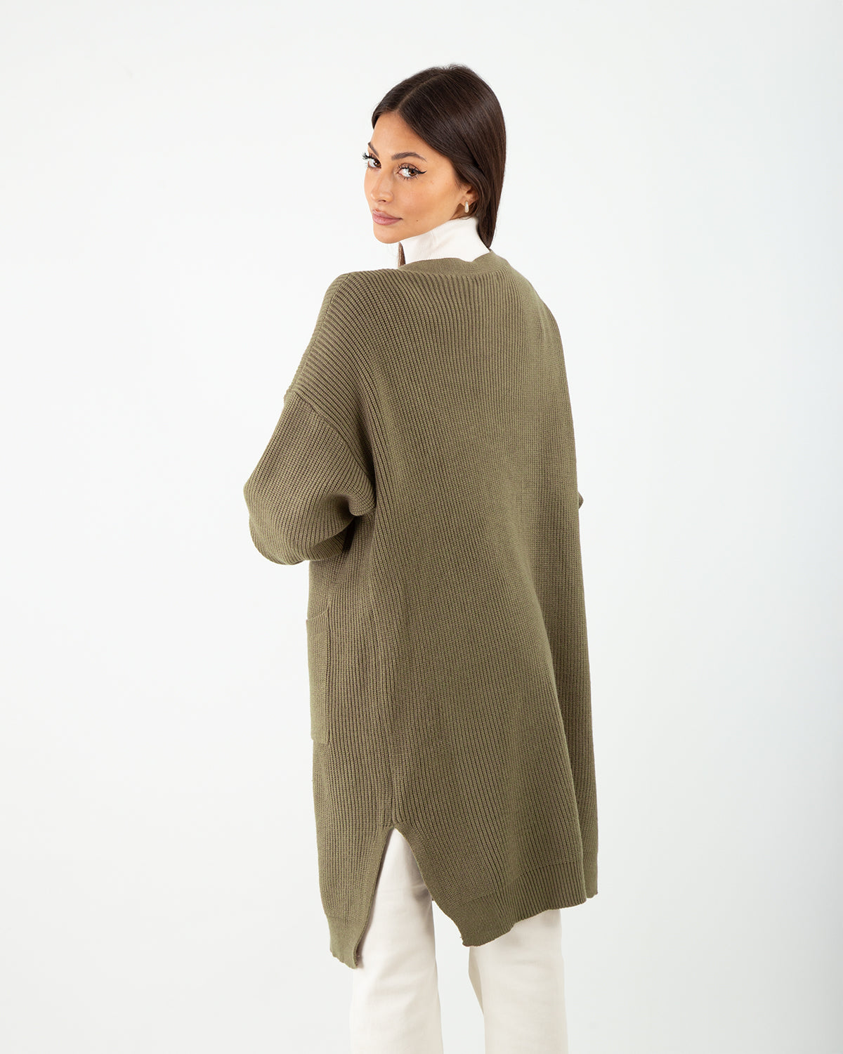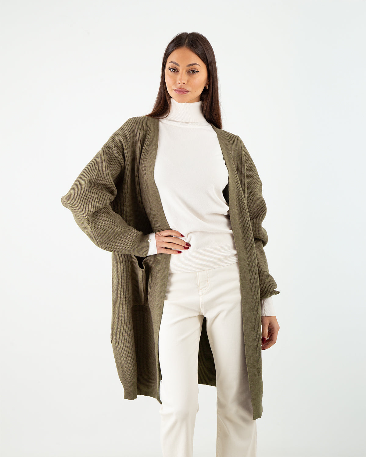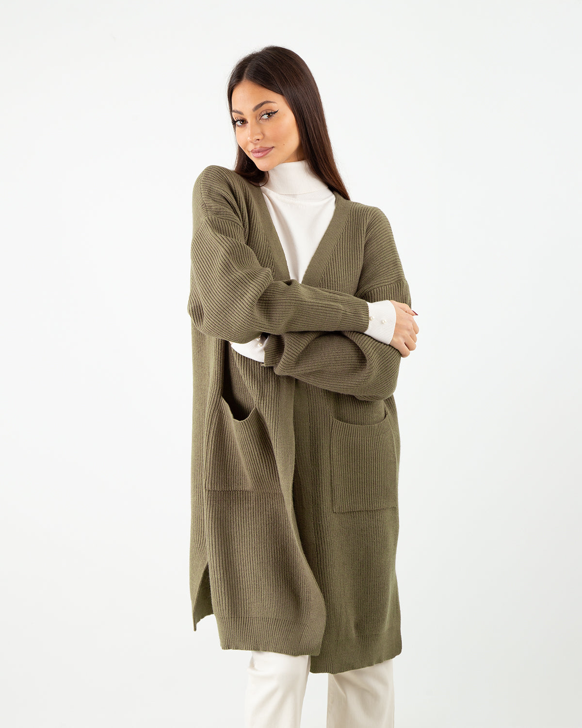 Questo cardigan lungo fino al ginocchio è pensato per chi ama un look casual ma curato. Le spalle cadenti donano un’allure morbida e avvolgente, mentre le due tasche applicate aggiungono funzionalità e un tocco pratico. Realizzato in morbido misto viscosa, offre una sensazione di comfort naturale e una vestibilità fluida, perfetta per essere indossata aperta senza chiusure. Un capo versatile da abbinare a look casual o più sofisticati, ideale per le giornate più fresche.