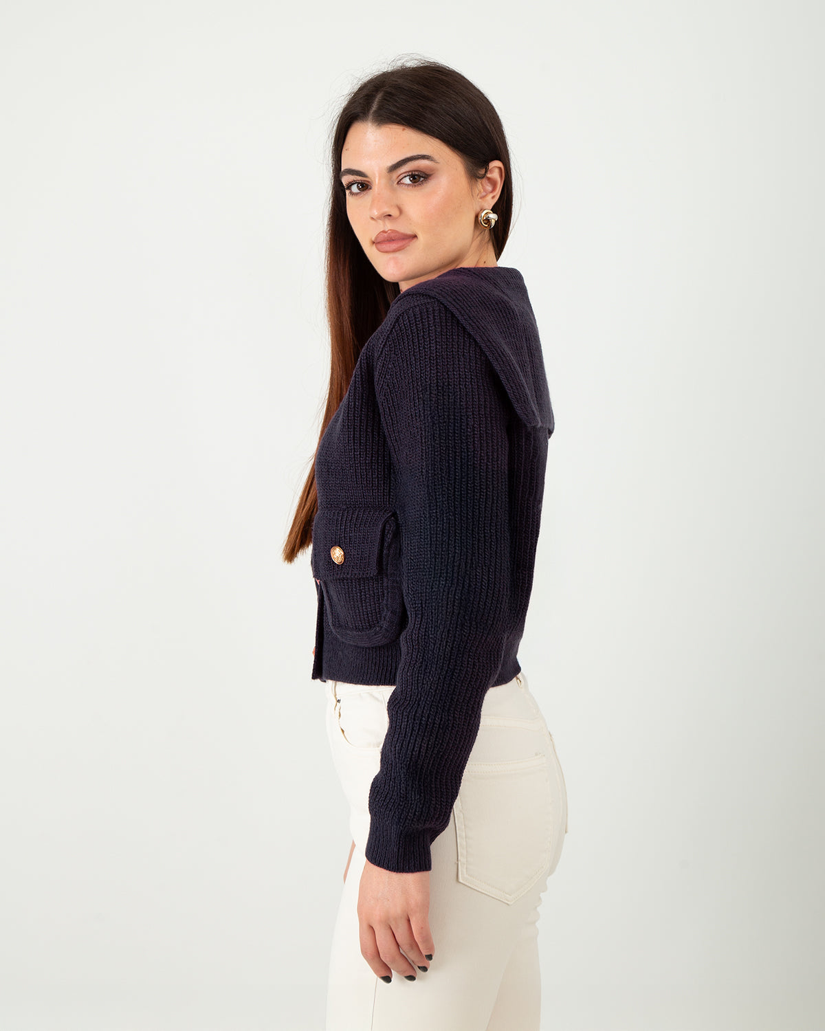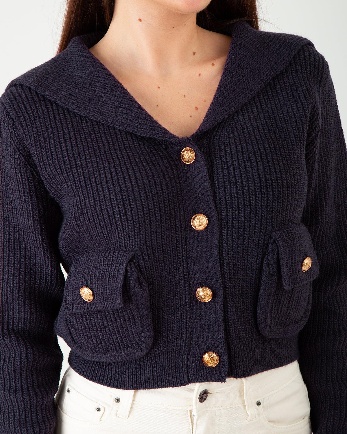 Questo cardigan in filato leggero è pensato per la donna che ama uno stile quotidiano raffinato, dove la praticità incontra la ricerca estetica. Morbido e confortevole, avvolge la figura con una maglia a costine che segue dolcemente le forme, offrendo una vestibilità naturale e piacevole. Il colletto ampio a V dona una linea femminile e distintiva, mentre i bottoni dorati con dettagli in rilievo aggiungono un tocco prezioso e sofisticato. Le tasche frontali con patta coniugano funzionalità e design, conferendo carattere a un capo versatile, perfetto da indossare sia da solo che in layering con capi basic per outfit minimal e curati. Un must-have senza tempo, che unisce stile e comfort in ogni occasione.