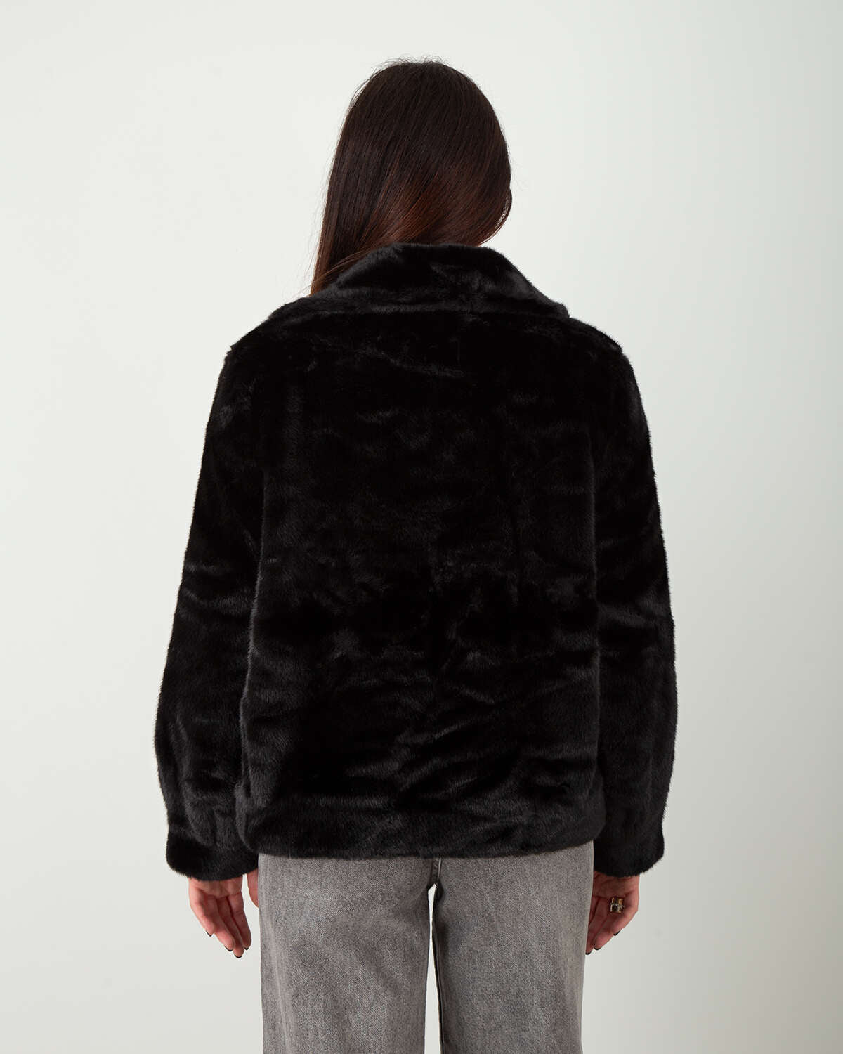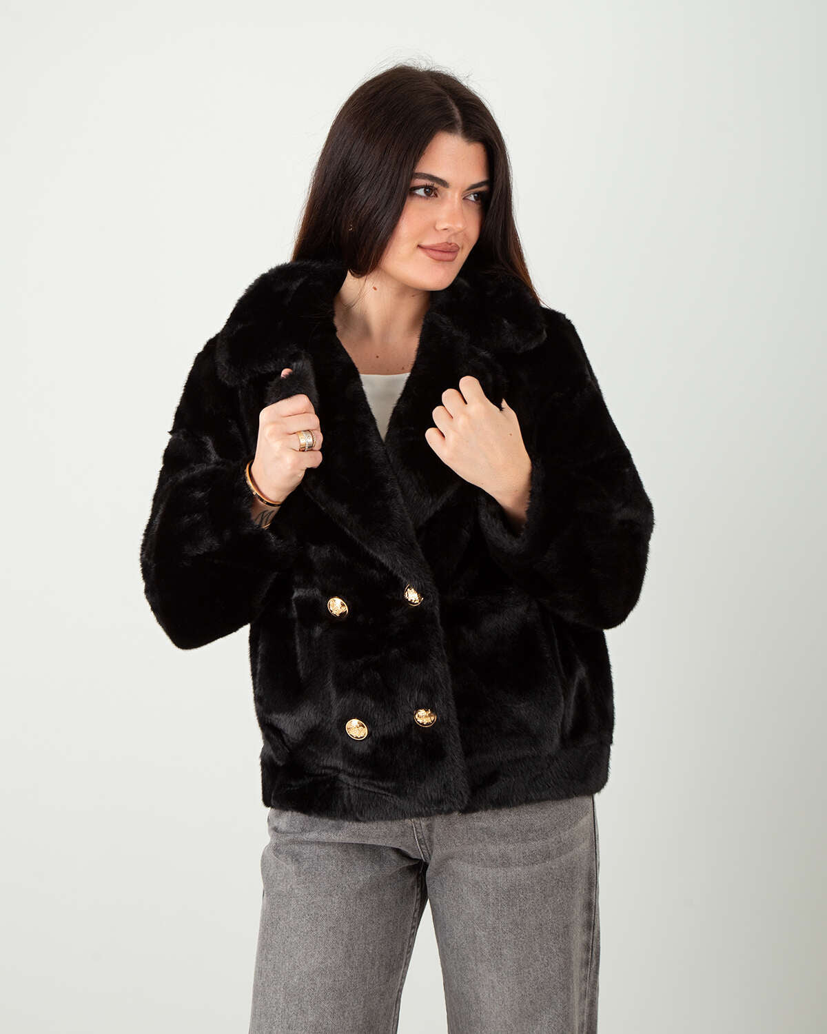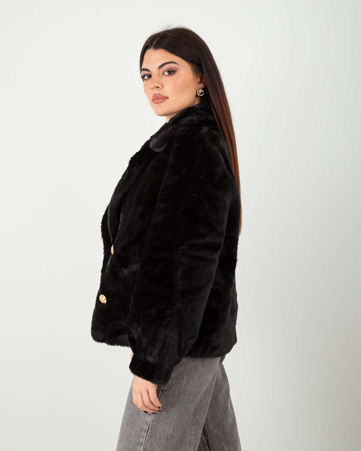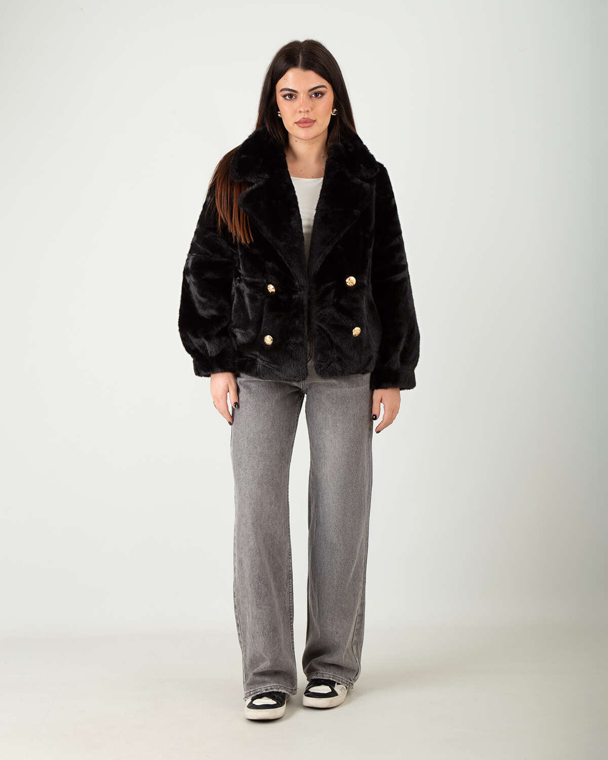 La giacca in eco-pelliccia nera doppiopetto è pensata per la donna che desidera un capo sofisticato, caldo e cruelty-free. Il design corto con colletto ampio e avvolgente dona struttura e carattere, mentre la vestibilità regular offre comfort e versatilità in ogni occasione. La chiusura doppiopetto con bottoni dorati aggiunge un tocco raffinato, rendendo questo capo ideale sia per outfit eleganti che per look casual chic. Perfetta per affrontare le stagioni fredde con stile e consapevolezza.
