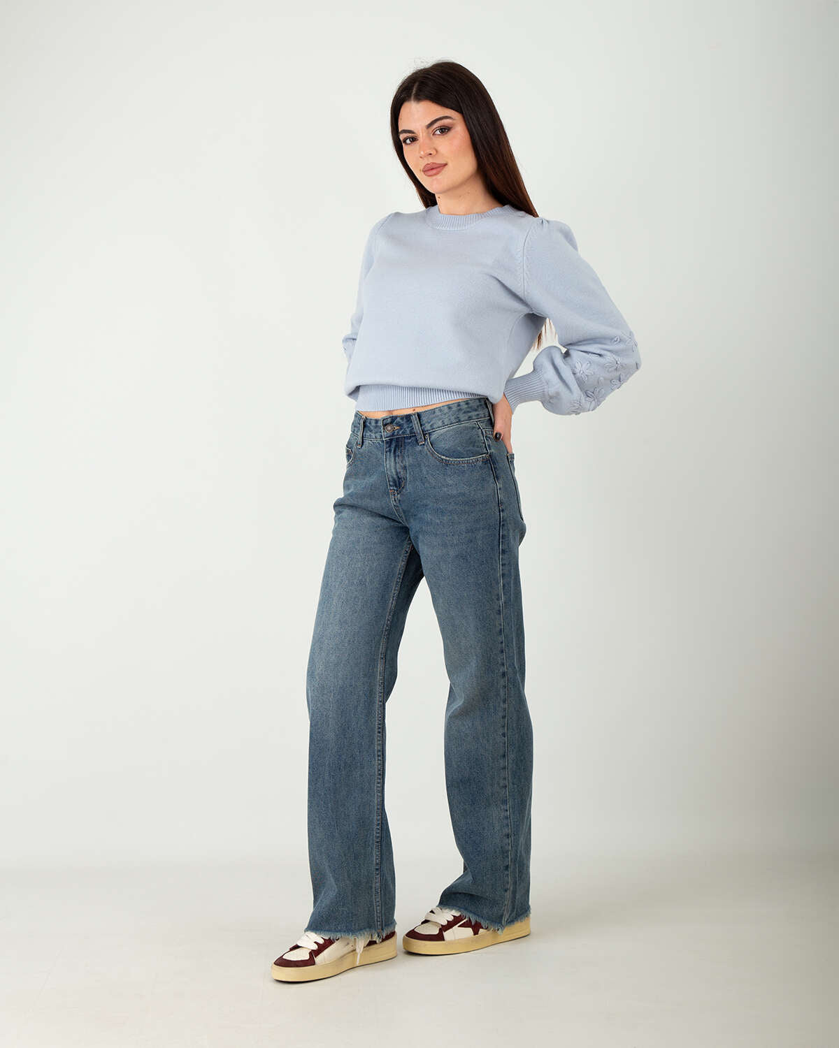 I jeans straight in denim blu chiarosono pensati per la donna che ama un look casual ma curato. La vita alta valorizza la silhouette, mentre la linea dritta segue delicatamente le forme senza costringerle, garantendo comfort e libertà di movimento. La chiusura con zip e bottone singolo aggiunge un dettaglio essenziale e funzionale. Perfetti da abbinare a stivaletti con tacco o sneakers, sono ideali per creare outfit versatili e contemporanei, adatti a molteplici occasioni.