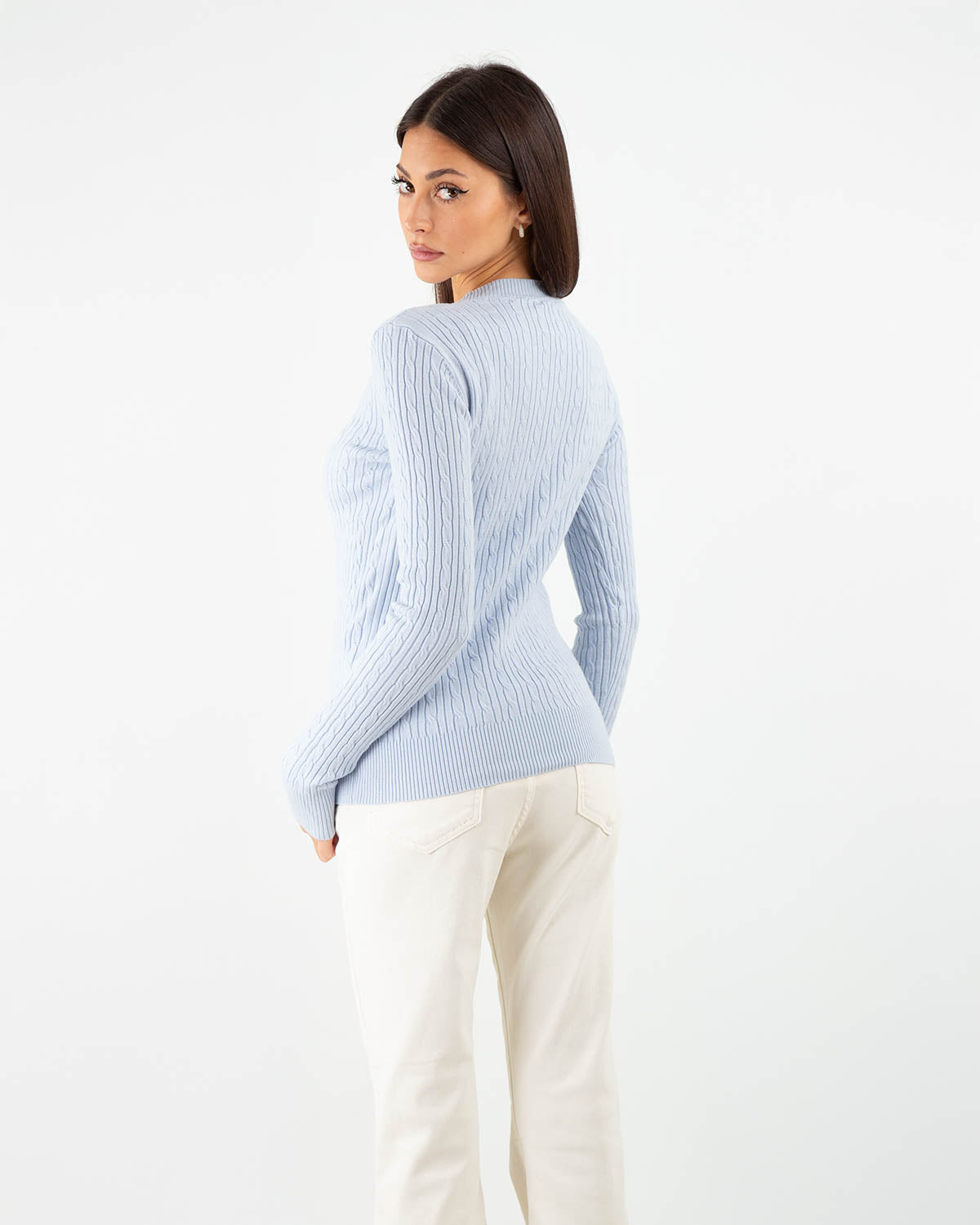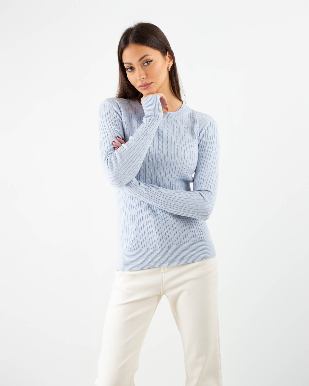 Realizzata in morbido e caldo misto viscosa, questa maglia avvolge la figura con una vestibilità aderente che valorizza le linee senza costringere. La lavorazione a treccino aggiunge un dettaglio raffinato, mentre il girocollo la rende un capo essenziale e versatile. Ideale da sola per un look pulito e femminile oppure sotto un blazer per outfit più strutturati e sofisticati.