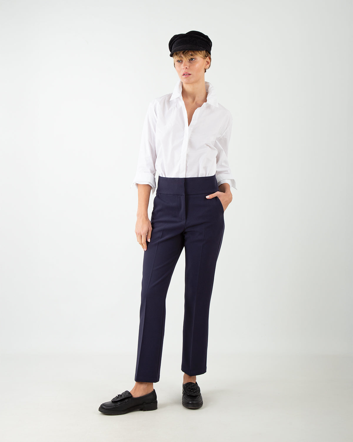 Dettagli: Pantalone a trombetta in morbido misto viscosa. Vita medio-alta con fascia di 7 cm circa per valorizzare il punto vita. Chiusura con zip, bottone e due gancetti.. Due tasche laterali e due tasche posteriori a filetto. Piega centrale sul davanti. Lunghezza standard.
