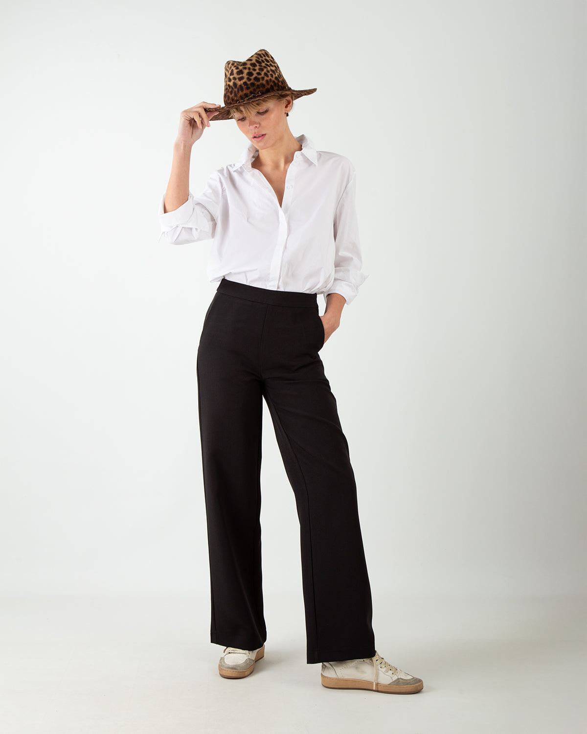 Questo pantalone palazzo a vita medio-alta scivola morbido sulla figura con un taglio dritto che valorizza la silhouette. Le due tasche laterali e quelle posteriori a filetto completano un design elegante, mentre la zip laterale nascosta garantisce una chiusura discreta e raffinata. Perfetto da abbinare a look più formali o da reinterpretare in chiave casual con una sneaker, un pantalone versatile che unisce stile e classe in ogni occasione.