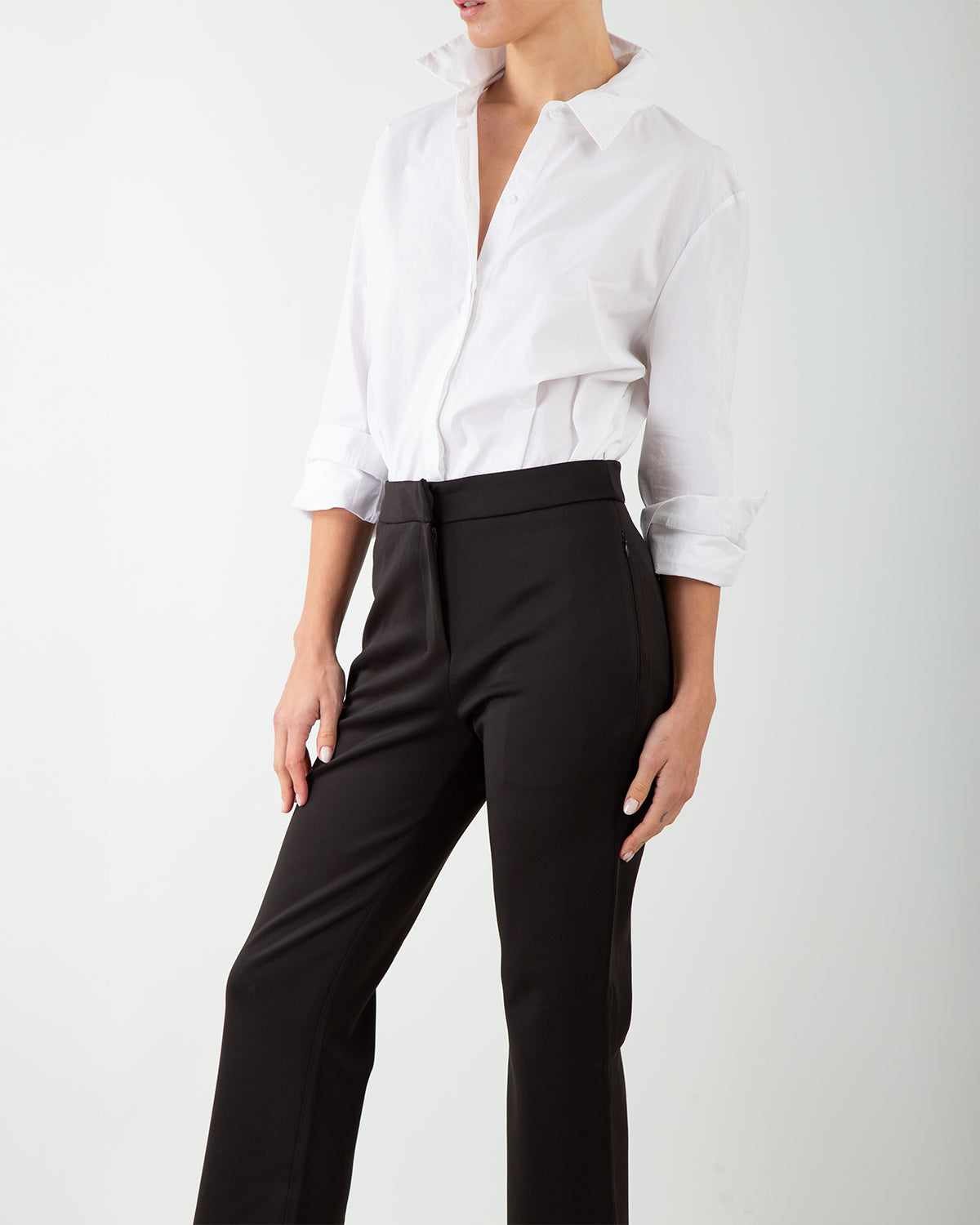 Dettagli: Pantalone a trombetta in tessuto tecnico misto viscosa. Vita medio-alta. Chiusura con zip e bottone invisibili. Due tasche laterali con zip invisibile. Fondo leggermente svasato.