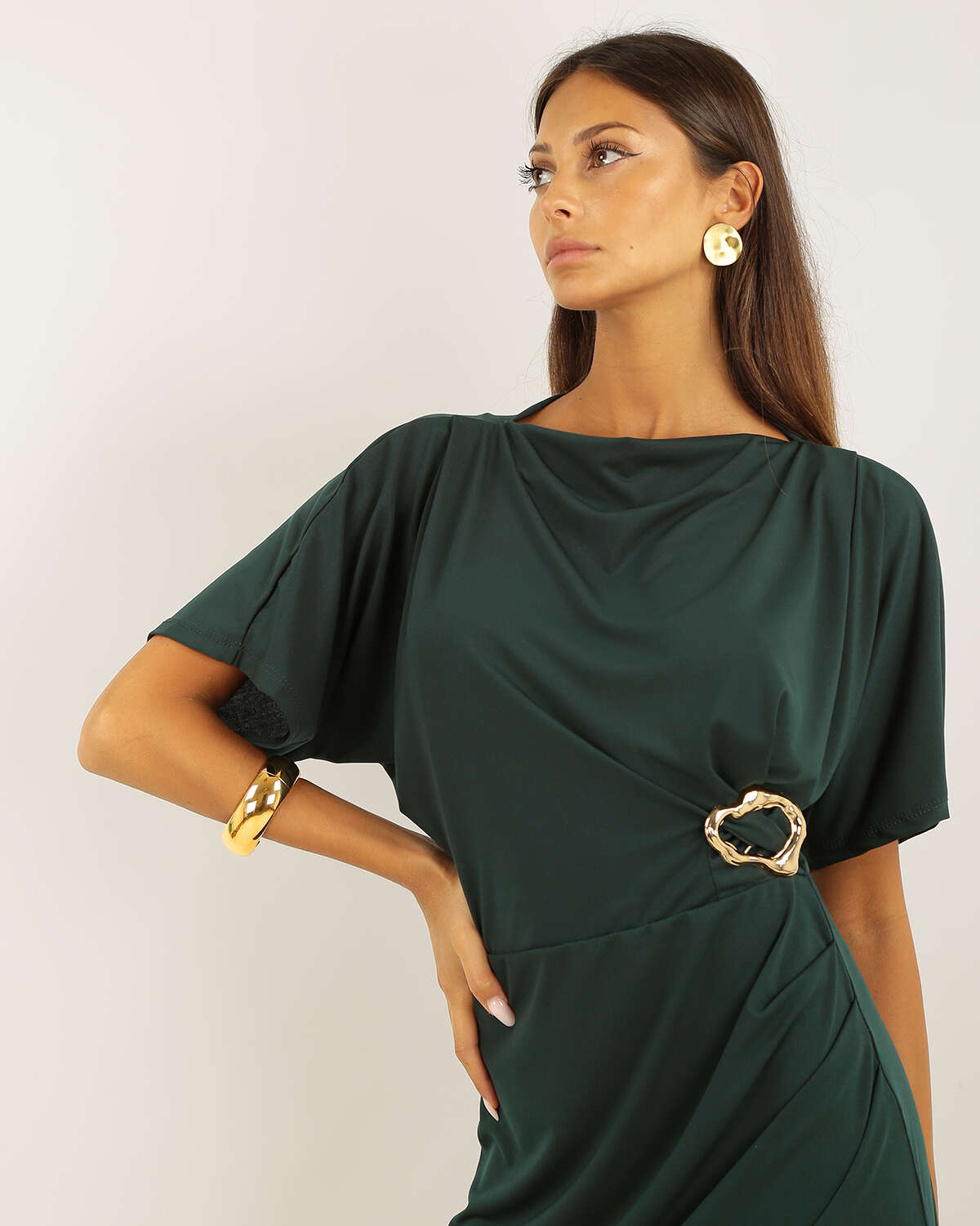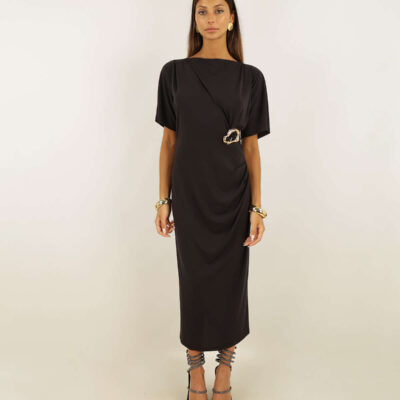 Un drappeggio laterale scivola morbido sul davanti, attraversando una fibbia decorativa in finitura dorata che illumina il punto vita con sobrietà.