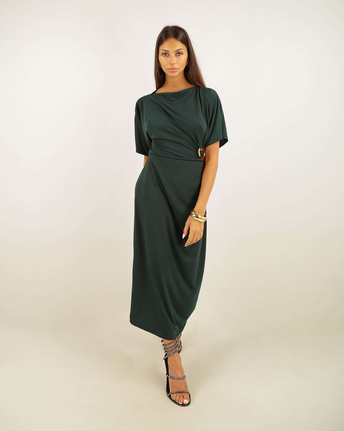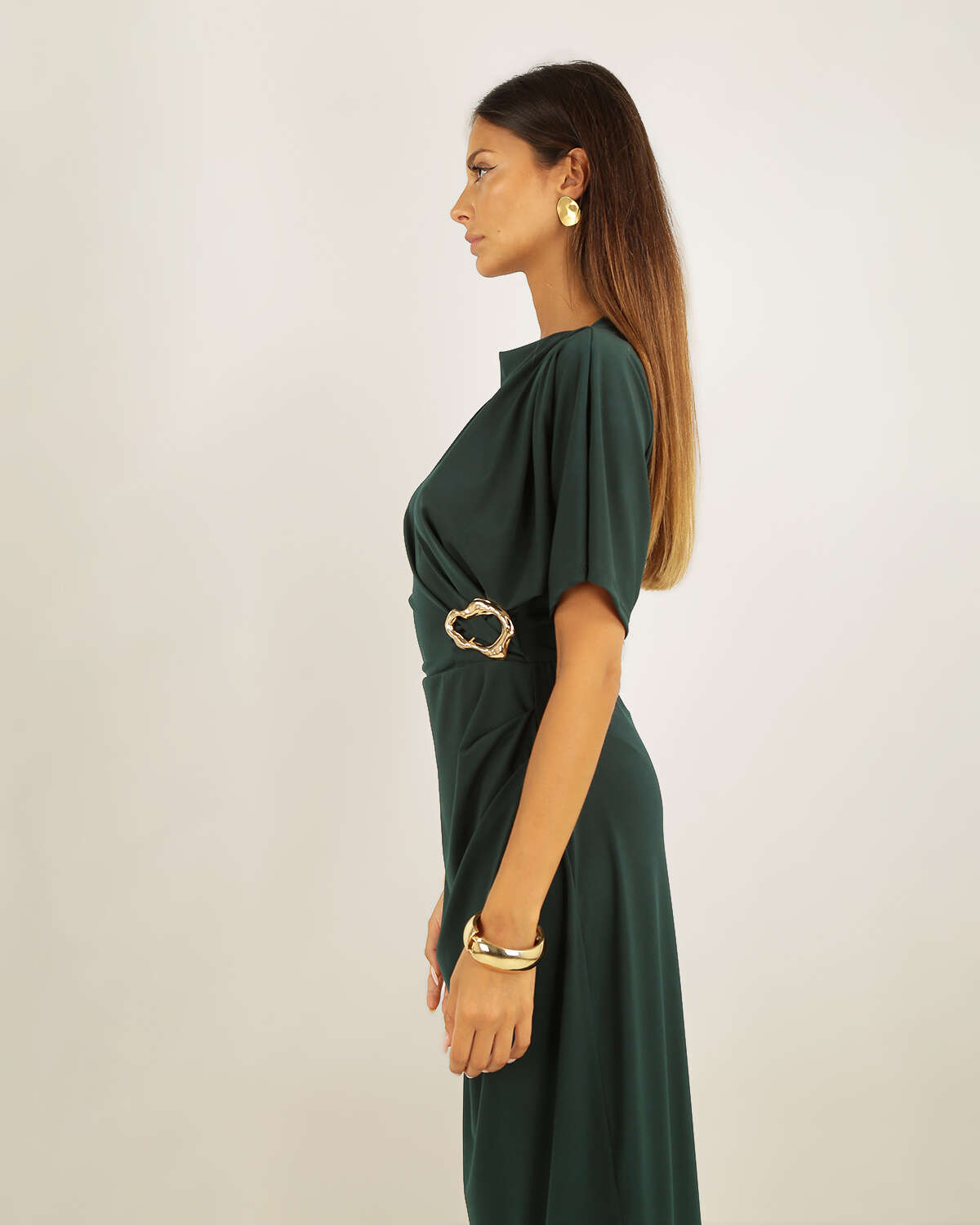 Abito lungo in verde bottiglia dalla linea pulita e raffinata, pensato per un’eleganza discreta e contemporanea.
